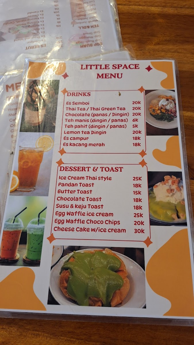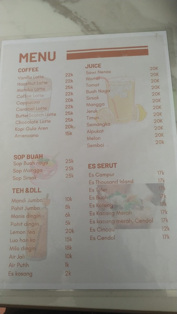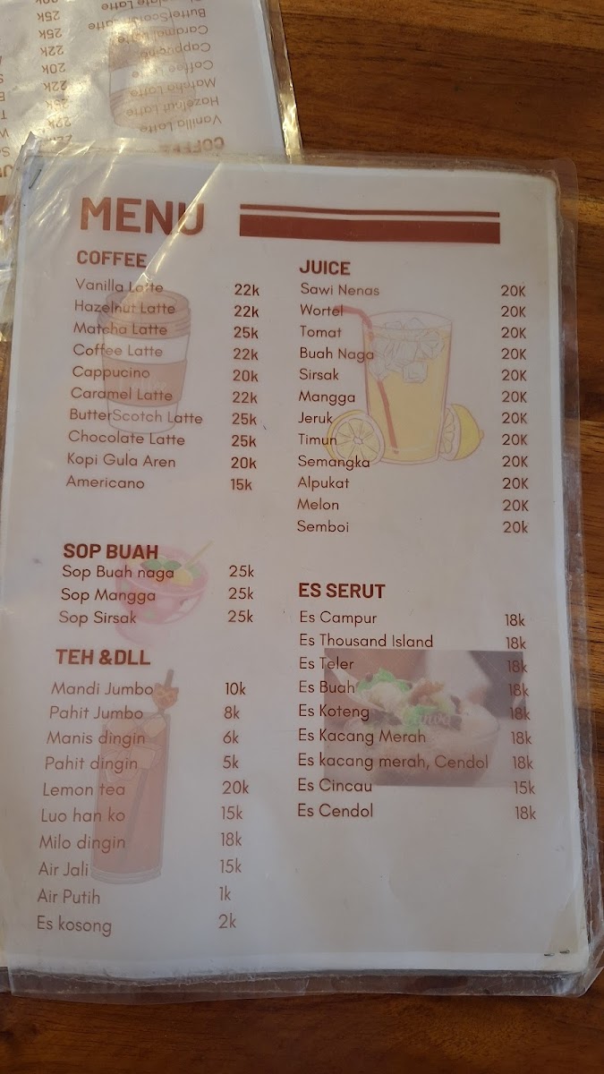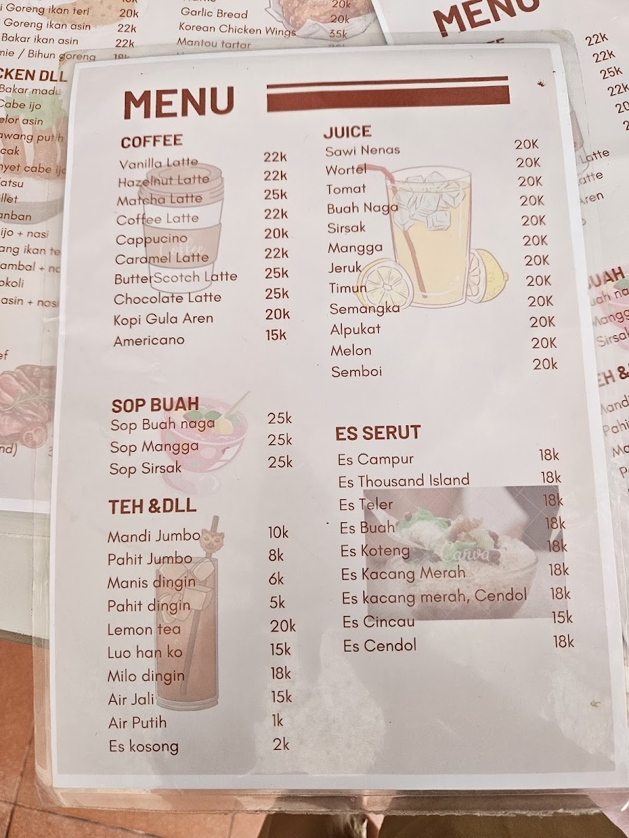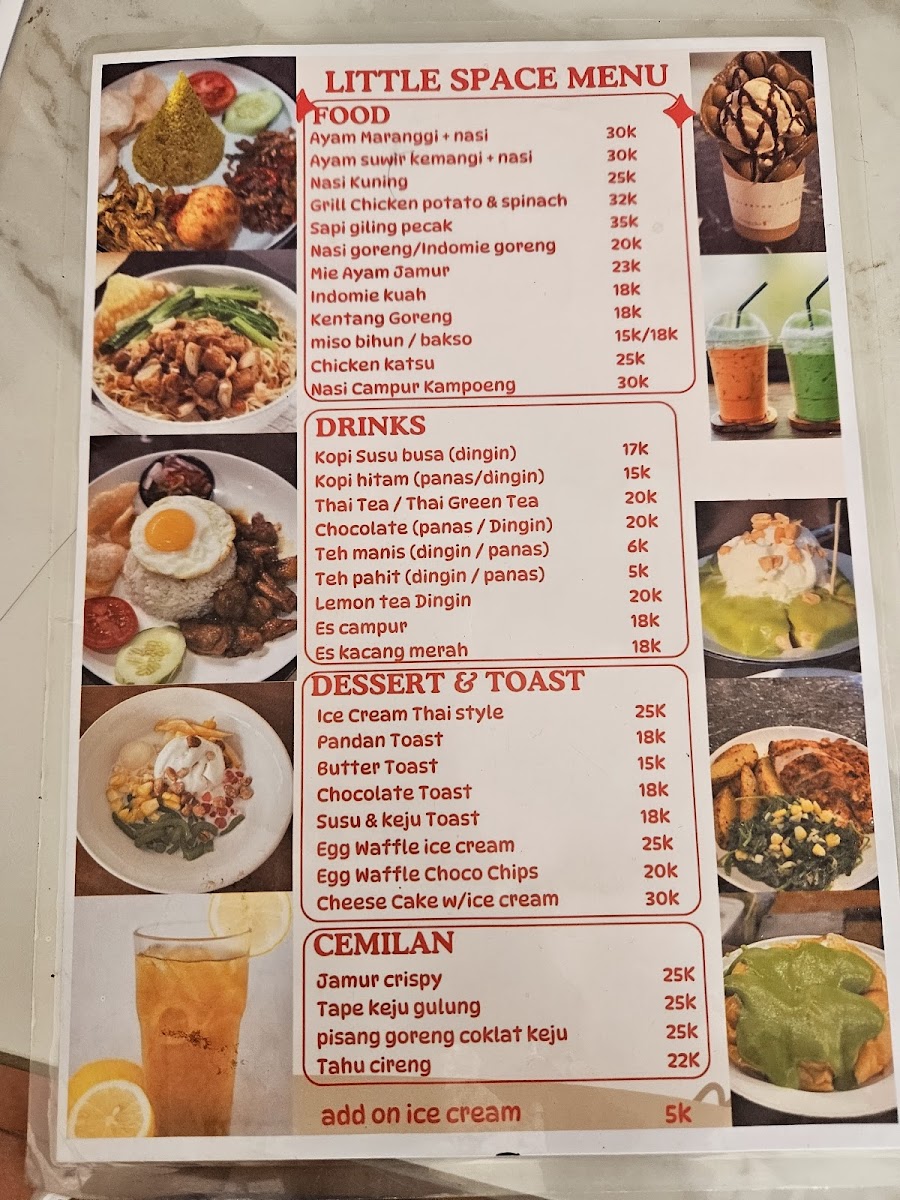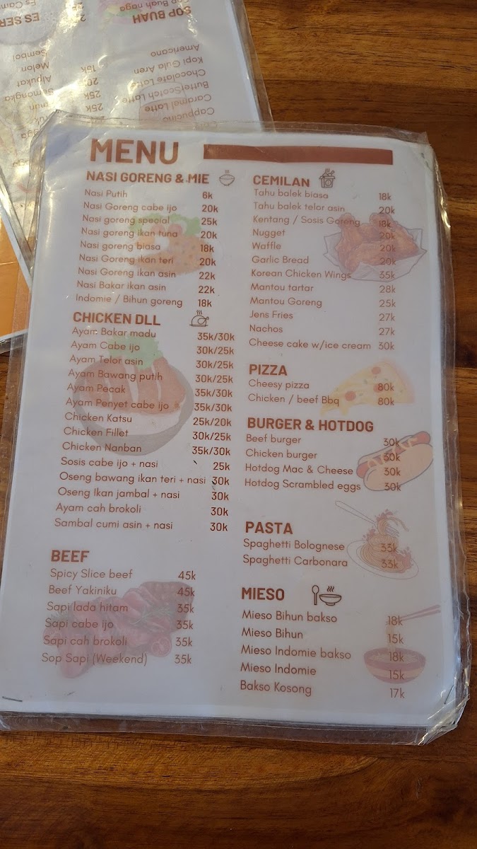 This cafe menu features a variety of food and drink options suitable for different times of the day, including breakfast, coffee breaks, and light meals. The offerings include a combination of local Indonesian favorites and some international dishes, providing a diverse selection for casual dining or quick orders.