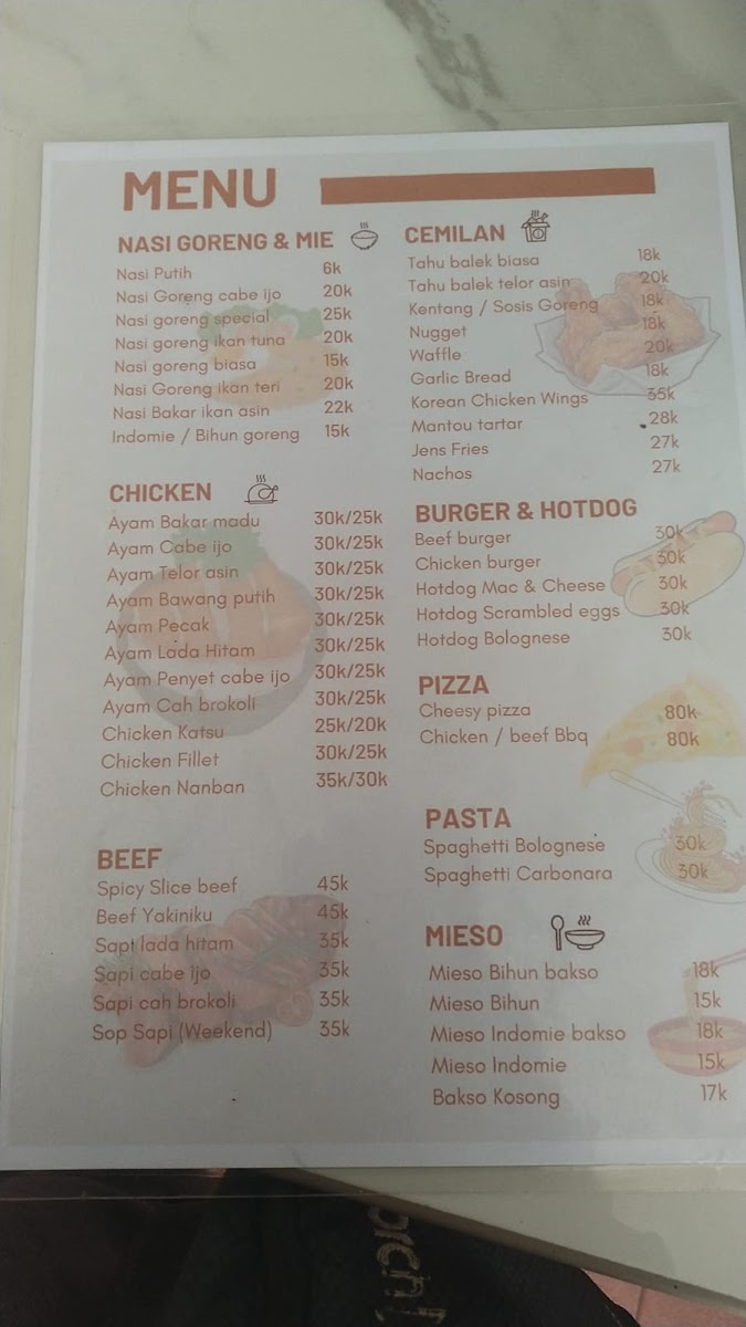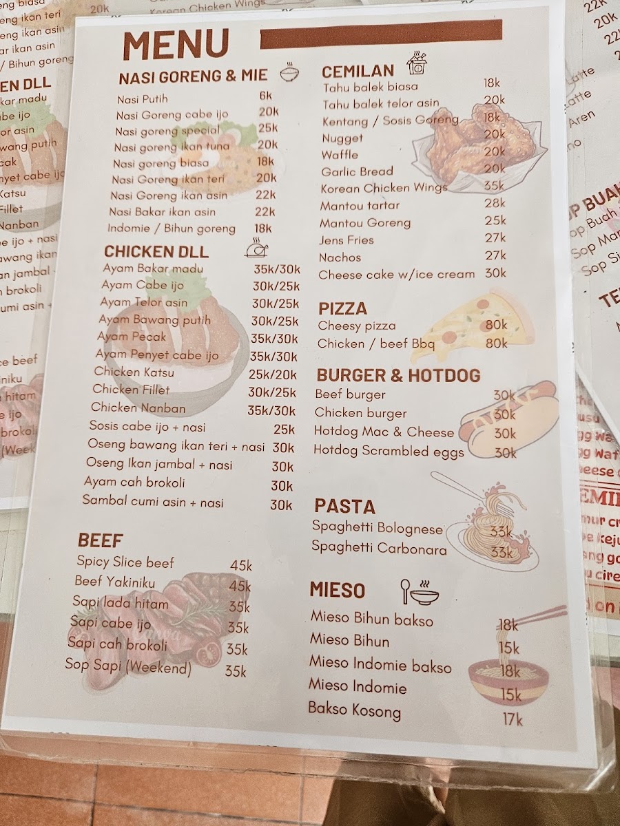 The menu highlights suggest a range of savory dishes such as Tahu Balek, Salted Egg Chicken with Rice, Nasi Ayam Telor Asin, and Nasi Goreng Cabe Ijo. There are also snack-style items like Mac&Cheese Hotdog and Mozzarella, as well as larger portions such as Miso Jumbo. For dessert or lighter cravings, options like Nutella Crêpes are available.